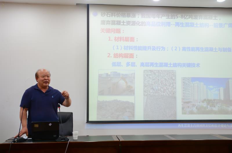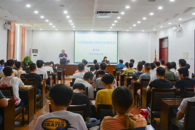 报告会上,曹万林从可持续混凝土结构、实践是创新的根基两大部分展开报告,并围绕研究背景与关键问题、再生混凝土材料、再生混凝土结构、再生混凝土组合结构、近期研究与思考等五个方面进行了详细阐述。报告过程中,曹万林重点对再生混凝土结构设计理论与方法进行了介绍。他结合自身多年的研究经验以及团队实验研究的经历,通过实验数据和实践成果的展示,分析总结了再生混凝土在各类结构中的应用情况,并对再生混凝土与普通混凝土在抗震、抗火、抗冻融、抗氯侵蚀等性能上的差异进行了分析。报告期间,曹万林语言挚朴,讲解深入浅出,展现了严谨的科研作风,流露出对青年教师和研究生学子在科研领域的殷殷期望。会后,对研究生的提问进行了耐心地解答。